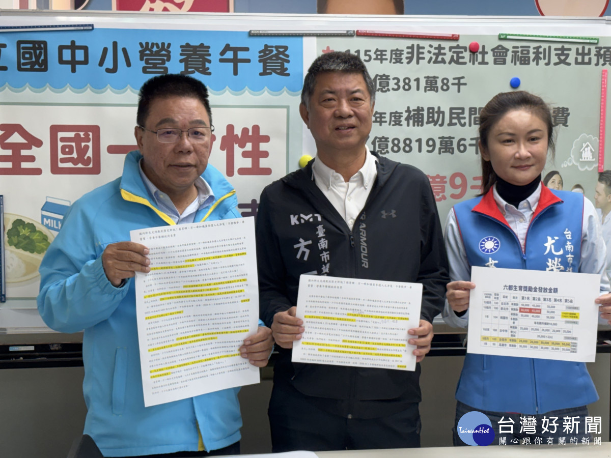 免費營養午餐成了全國最夯議題!台南市議員蔡育輝、方一峰和議員參選人尤淨寬12日舉行記者會,高分貝向中央政府喊話,少子化是國家最大國安危機,蔣萬安送北市學子營養午餐全免的新春賀禮,藍白營市長跟進,連黃偉哲、陳其邁也急轉彎接力,中央政府應該聽到全國荷包緊縮家長的心聲,應該打造一套完整的少子化解方,從生育津貼、托育補助、不孕補助、育嬰假彈性化、托育公共化、提供婚育宅,把錢花在刀口上,才能讓年輕人「足感心」。