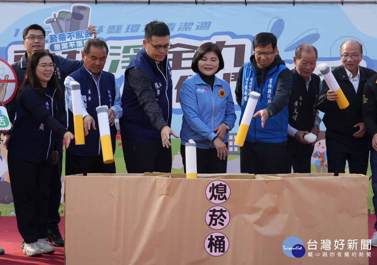 今年環境清潔週以「雲林淨全力,作伙鬥陣清」為主題,象徵全縣齊心協力迎接嶄新的一年,張麗善也頒發感謝狀給62個認養設置熄菸桶的公私部門及民間企業團體,並與水林鄉代理鄉長張東凱、議員黃文祥等貴賓共同將「菸蒂」丟入熄菸桶,展現全力推動「菸蒂不落地」政策的決心。