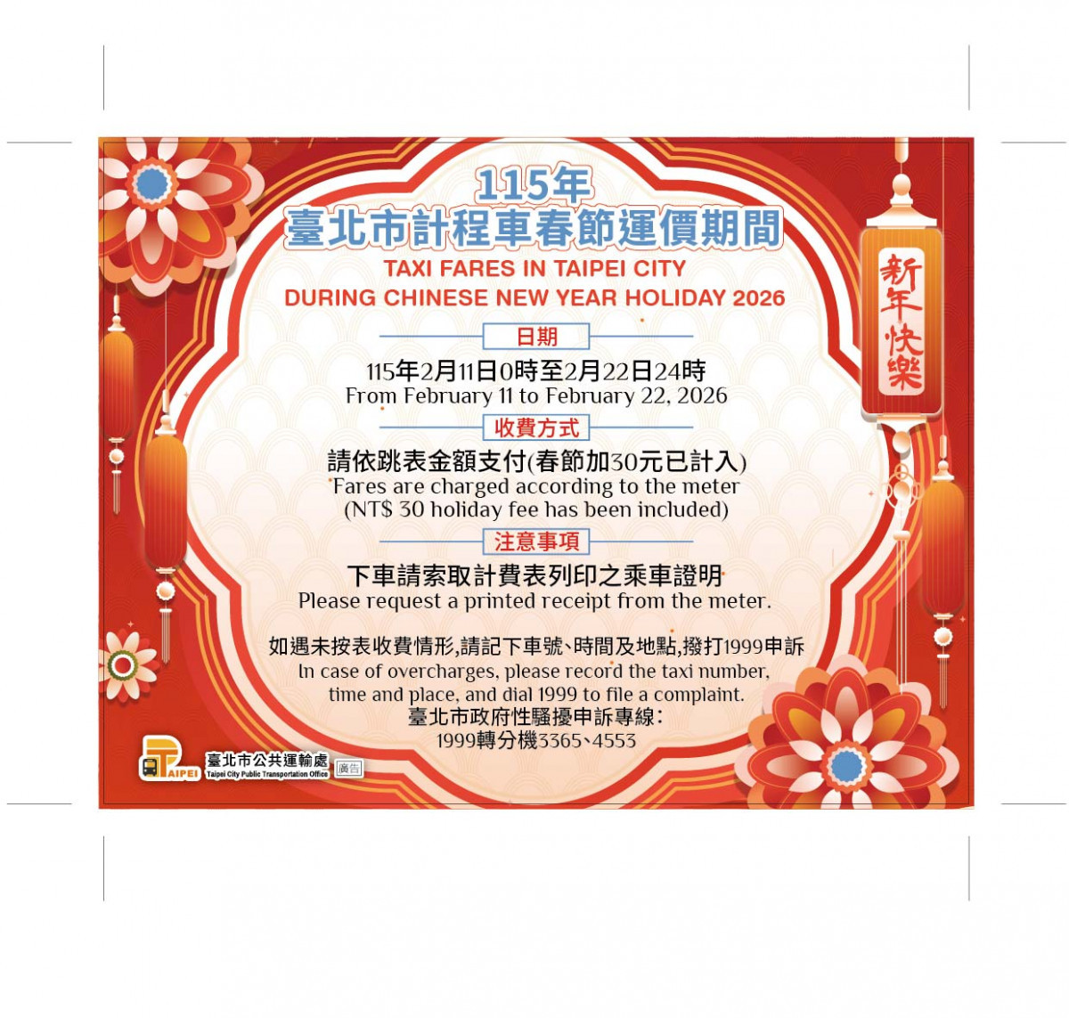 農曆春節即將來臨,因應年前送禮訪友及春假期間走春拜年乘車需求,為鼓勵計程車運將朋友疏運旅客,115年臺北市計程車春節加成運價(每趟加收30元)將自2月11日(三)零時開始,至2月22日(日)24時止,以上車時間為準,共計12天,於臺北市境內上車之乘客請依計費表跳表金額支付車資,計程車駕駛人須使用新式計費表內建功能選取春節加成,如未選取春節加成鍵者,仍應依跳表金額向乘客收費,不得額外加收。