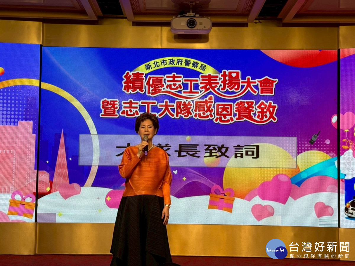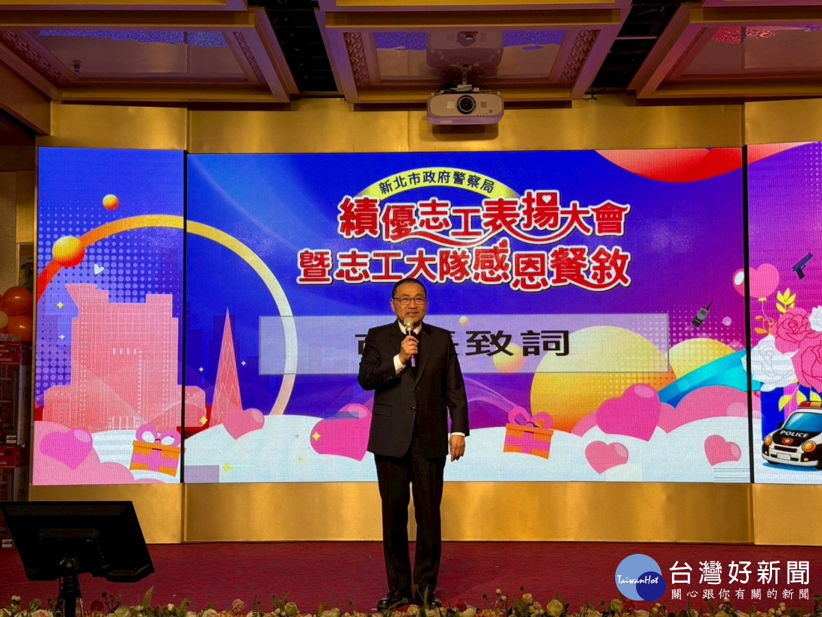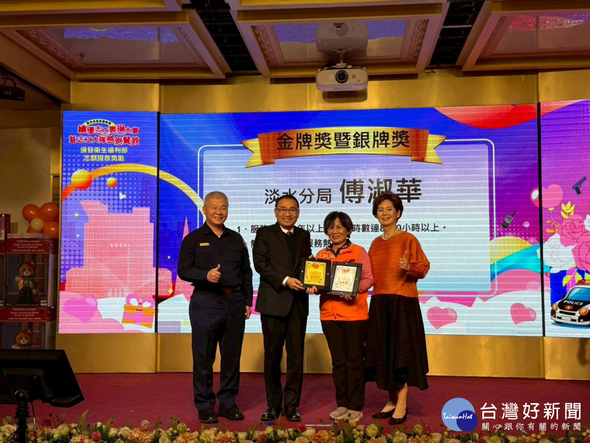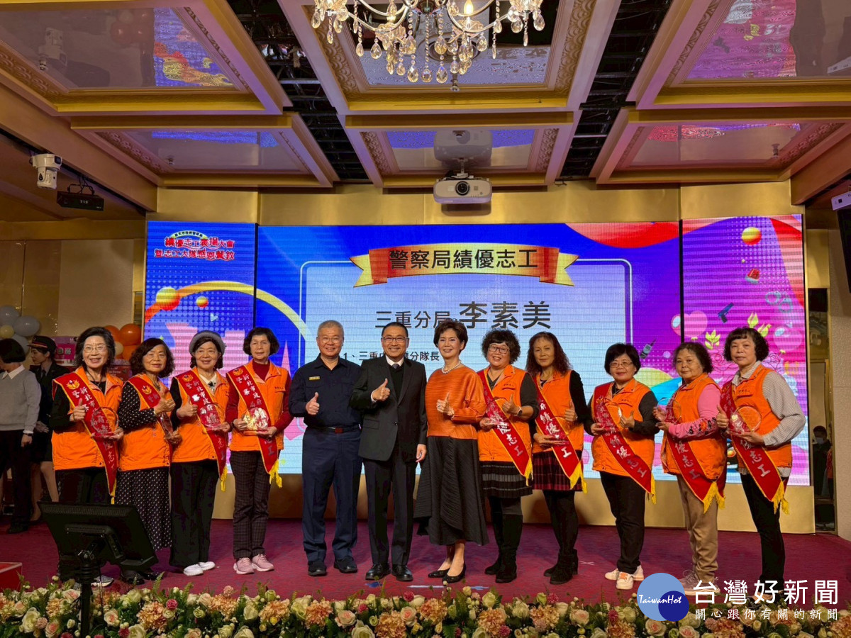 新北市長侯友宜、警察局長方仰寧及志工大隊大隊長蔡月美,昨(26)日晚間出席警察局績優志工表揚大會,侯市長頒發獎項給65位志工楷模,肯定其無私奉獻與卓越貢獻。