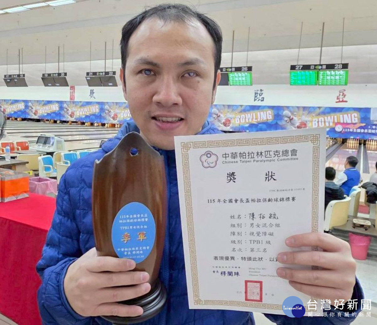 社團法人擁抱生命行善協會所支持的視障朋友陳柏毓,2月7、8日參加中華帕拉林匹克總會所舉辦「115年全國會長盃帕拉保齡球錦標賽」,與全國另外8位好手同場較勁,最終脫穎而出拿到第三名。