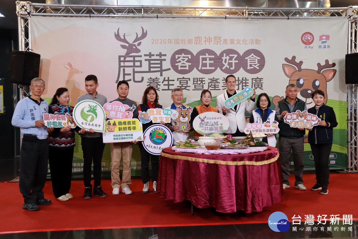 南投縣國姓鄉飼養的水鹿約3800頭居全國之冠,國姓鄉公所多年來積極推廣水鹿養殖產業舉辦鹿神祭,近年進一步推廣客庄料理,2月10日在縣府一樓大廳再度舉辦「2026國姓鹿神祭產業文化活動」系列首場活動—「客庄好食.鹿茸養生宴暨產業推廣展示會」,為年度盛會揭開序幕;除展示養生宴研發出精緻佳餚外,還有國姓鄉鹿茸周邊商品、在地農產展示、國姓咖啡、客庄美食與水鹿導覽圖,營造文化與產業融合的氛圍,將鹿茸導入更多元消費場景。