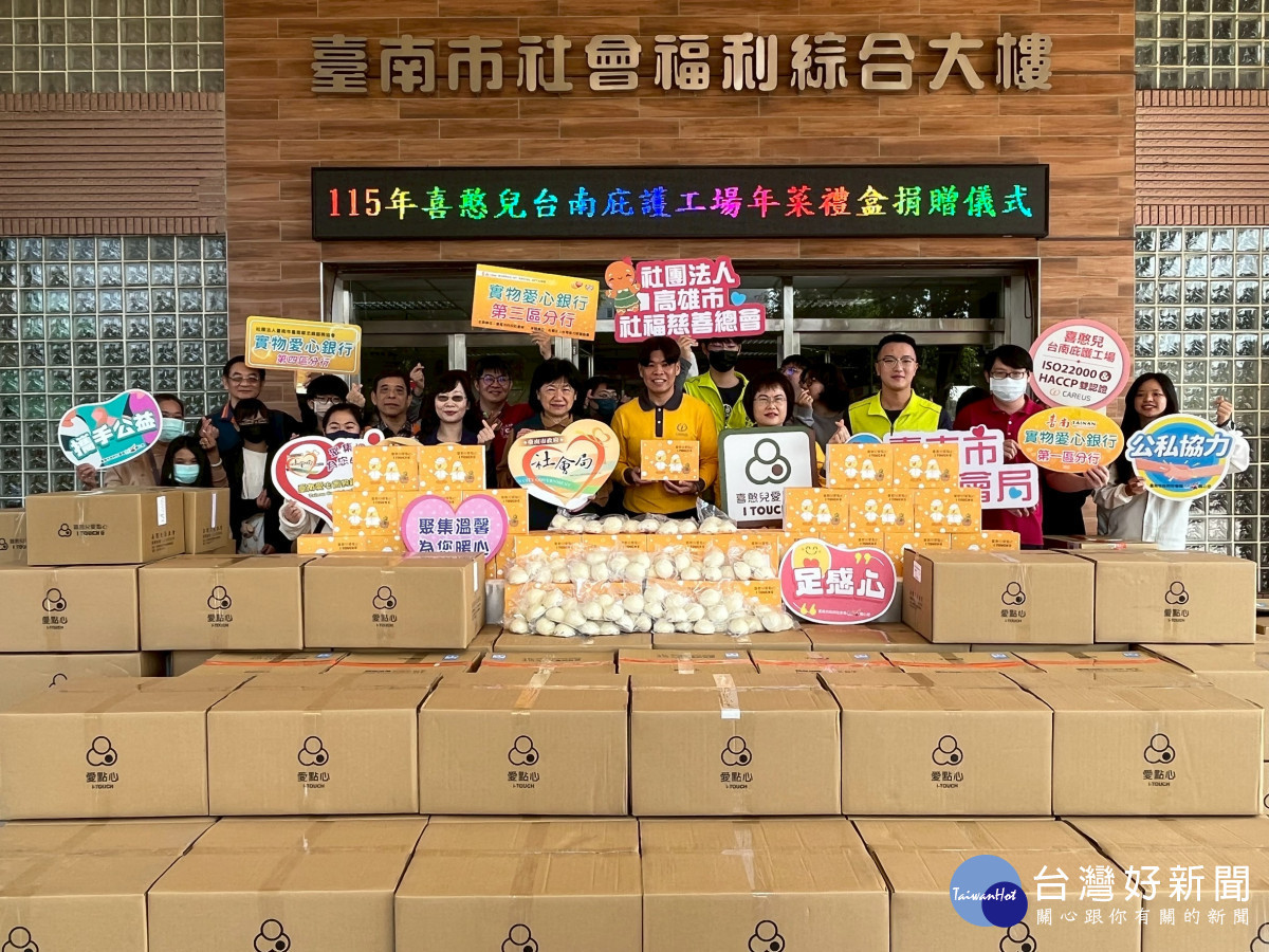 黃偉哲市長感謝喜憨兒台南庇護工場,長期投入關懷弱勢族群行列,不定期號召善心人士認購物資捐助本市弱勢家庭,陸續於108年10月捐贈鮮凍食品506組、110年11月提供防疫物資105箱(鮮凍食品)、112年6月捐贈300份端午節物資,並於113年至114年間捐贈年菜禮盒;今(115)年農曆年前,台南庇護工場再度捐贈830份年菜禮盒,受贈對象涵蓋本市實物愛心銀行服務個案及社會局關懷之脆弱家庭等弱勢家戶,使其在年節前夕也能感受到團圓溫暖與社會關懷。