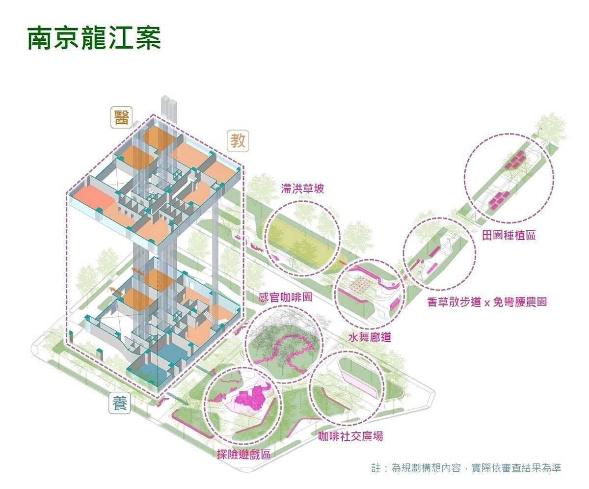 南京龍江案以「綠色十字樞紐」為核心,設計別具巧思,生態與歷史交織: 北側基地化身為融入「霧裡薛圳」歷史意象的公園,設有生態滯洪草坡與親子田園,讓高樓林立的市中心擁有五感體驗的自然教室。全方位生活支援: 南側建築低樓層則鎖定「全齡需求」,規劃診所、幼教機構與質感咖啡廳。國家住都中心說明,這不僅呼應了鄰近復華公園著名的「咖啡公園」氛圍,更形成一個完整的「醫/教/養」支援網絡,讓長輩就醫、孩子上學、中壯年休憩都能在步行圈內完成。
