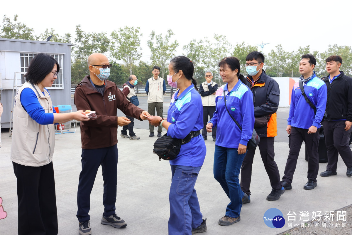 除向全體辛勞的清潔隊員致上誠摯謝意、一一為出勤的垃圾車隊加油勉勵,陳永豐也致贈全體同仁「粉紅超馬」新春紅包,並送上30箱象徵大吉大利的茂谷柑與5箱桶裝水,慰勞這群默默付出的城市英雄。