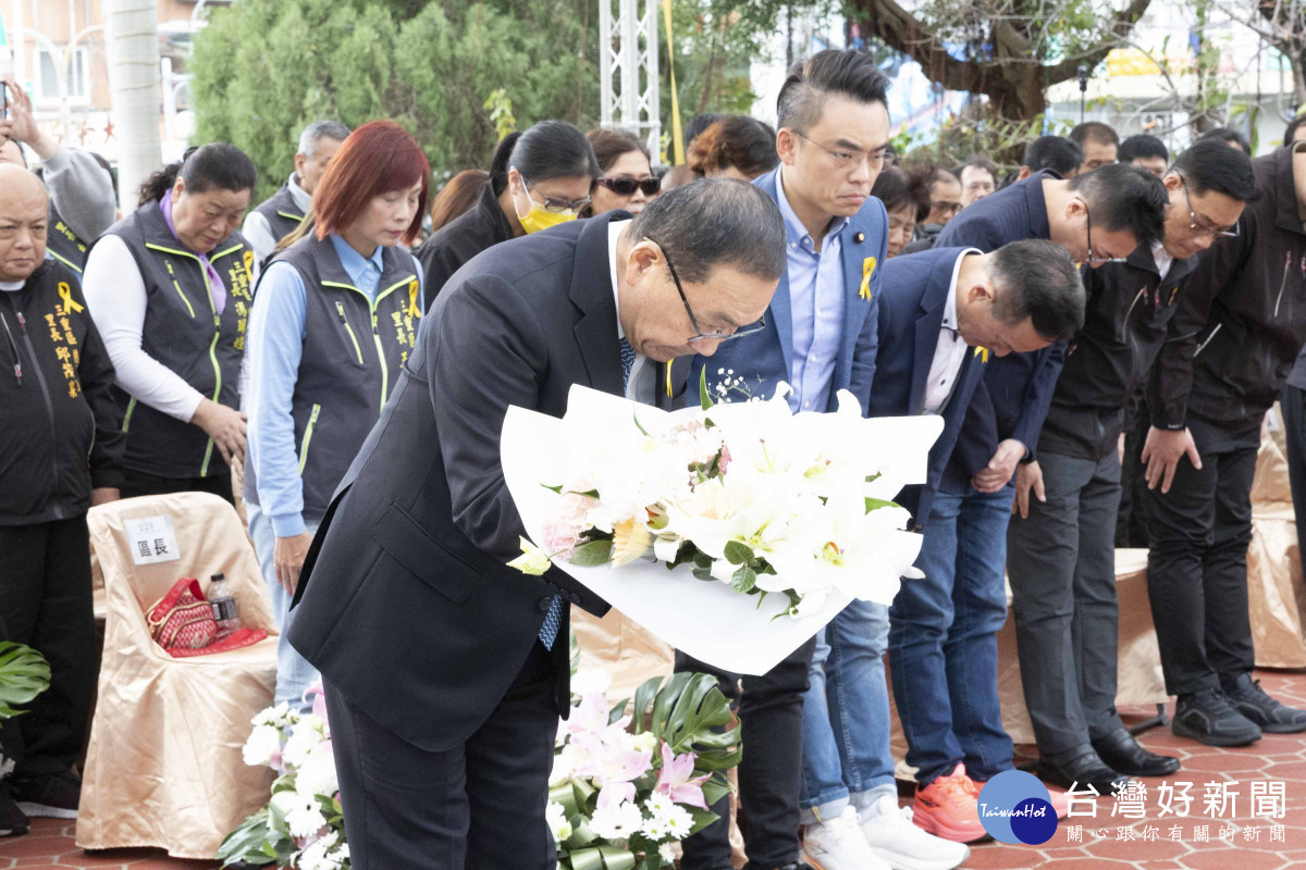 侯友宜接著帶領民眾默哀、於紀念碑前獻花,並逐一遞送鐵炮百合給受難者家屬獻花,撫慰受難者心靈,傳遞和平與希望,氣氛莊重而溫馨。侯友宜同時感謝新北市二二八總會自2014年成立至今的努力,讓年輕世代更瞭解先人對這塊土地的付出。