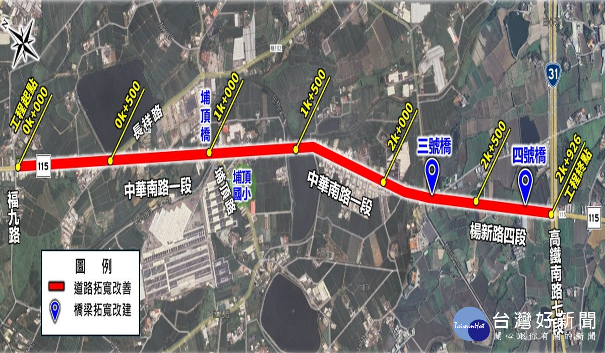 工務局指出,本計畫路段位於市道115,是串聯新屋區與楊梅區的交通要道。現況路幅僅約10公尺,部分跨渠橋梁寬度僅約7至8公尺,造成大型車輛與機慢車共道,事故風險高。透過本次拓寬,將銜接北側新屋都市計畫區,重要路口導入偏心式左轉車道、彩色行穿線與「小綠人」行人號誌,引導人車有序通行,強化路口辨識度,並配置人行道、新設道路側溝及公共設施空間,完整市道115路幅,提升現況道路服務水準,改善聯外交通之易行性。