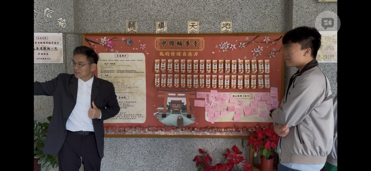 校長鄭俊楠表示,青春期的孩子在成長過程中,難免會遇到課業、人際與未來方向的各種疑問與壓力,學校希望透過多元且有創意的輔導活動,提供學生一個安心表達與思考的空間。「中興輔導寺」正是希望讓學生知道,當心中有疑問時,校園裡永遠有一個願意傾聽與陪伴的地方。透過這樣的活動,不僅能拉近師生之間的距離,也能讓學生學會整理自己的情緒與想法,逐步建立面對人生挑戰的信心與力量。