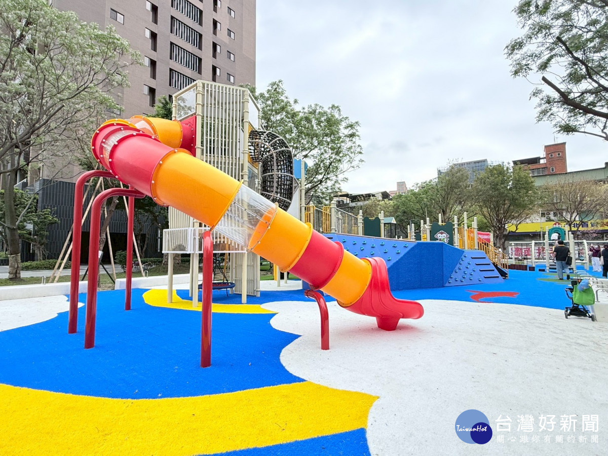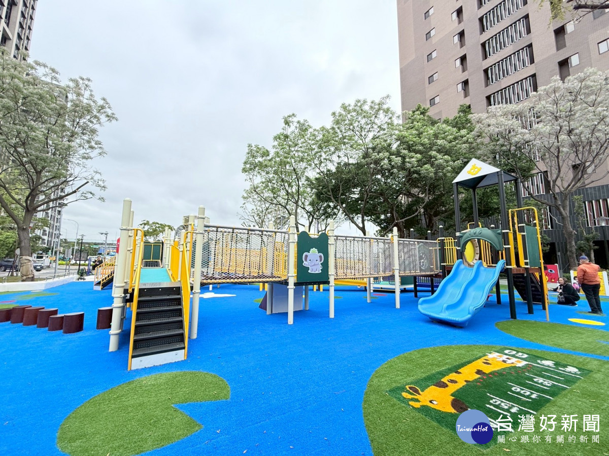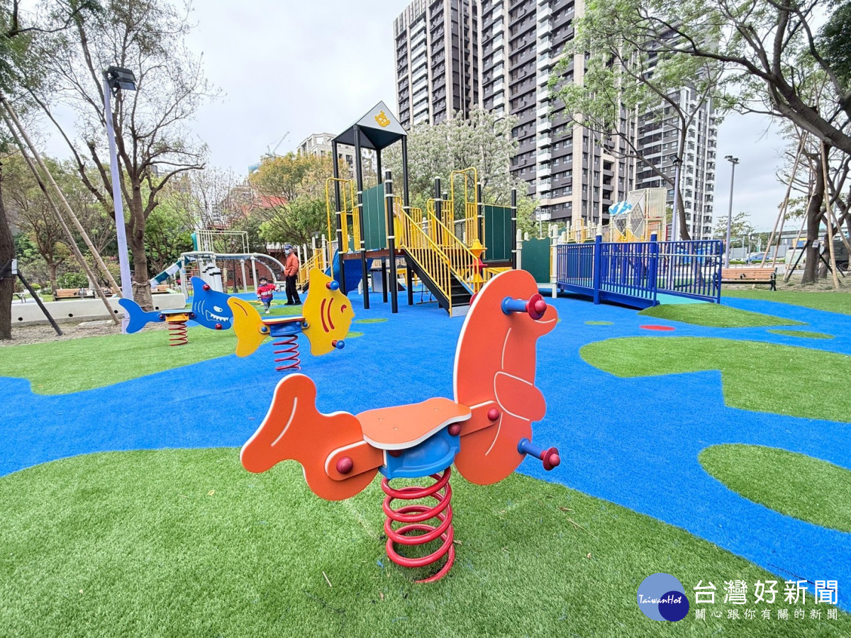 公園內設置全新的大型複合式遊具,主體採用吸睛的「魚躍龍門」造型設計,設計巧妙連結了立體爬網空間、攀岩塊斜面及組合遊具。此外,周邊配置了共融森林轉盤、共融鞦韆、共融溜滑梯與多款造型搖搖樂,其中包含與主題呼應的藍色魚兒造型,能有效訓練孩童的抓握力與平衡感。全區鋪設嶄新的安全彈性地墊與造型人工草皮,大幅提升緩衝保護,搭配無障礙多功能通道,讓不同能力的孩童都能安心挑戰各項關卡。