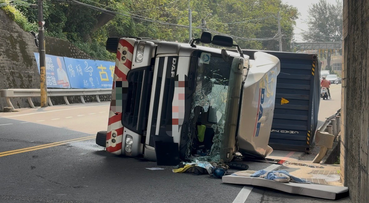 楊梅警分局表示,23日上午 10 時許接獲報案,指稱楊新路一段與新梅一街路口發生車輛翻覆意外。員警趕抵現場發現,貨櫃車因撞擊涵洞造成車體傾斜翻覆,現場滿地碎片,所幸李姓駕駛在意外發生後意識清醒,送醫後確認無生命危險。