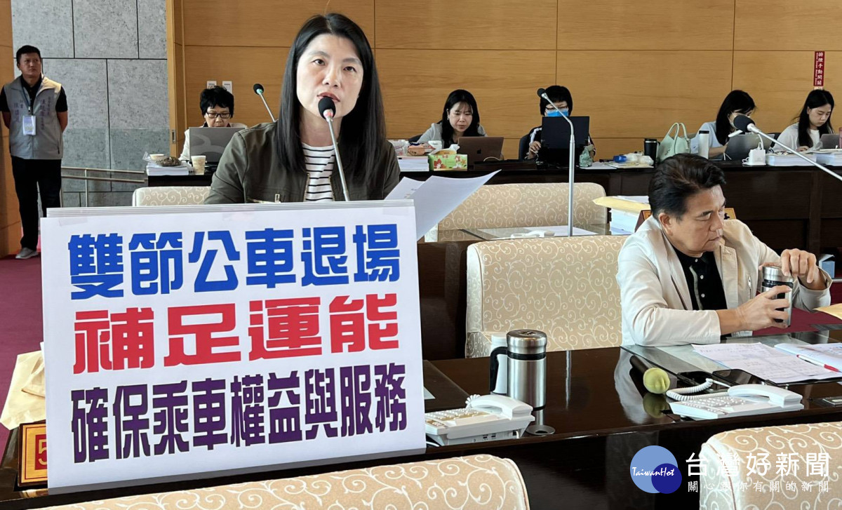 台中市議會定期大會專案報告,市議員張廖乃綸關切台中市公車運量議題,要求交通局針對台灣大道雙節公車退場,必須要補足相對的運量,不能影響民眾搭乘品質及權益。