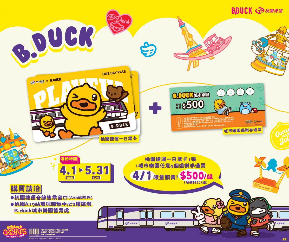 「桃捷 x B.duck城市樂園聯票」票種說明:https://reurl.cc/zQrQ5N