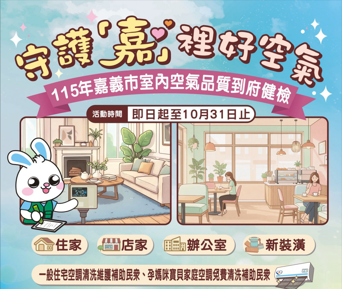 為提升市民居住與工作環境室內空氣品質,嘉義市府環保局今(115)年持續推出免費「到嘉診斷」室內空氣品質檢測服務,活動自即日起至10月31日止,共提供100位申請名額,同時也結合住宅空調清洗維護補助計畫,鼓勵民眾透過冷氣清洗進一步提升居家空氣品質,想了解所處環境室內空氣品質之市民朋友,請把握機會踴躍申請。