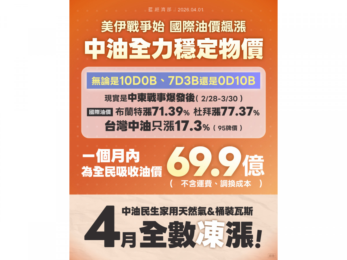 台灣中油在4月1日也宣布,4月份天然氣民生用戶及桶裝瓦斯價格也維持不調整;中油為了降低國際油價波動對民生影響持續努力,希望大家不要因片面資訊而造成誤解。