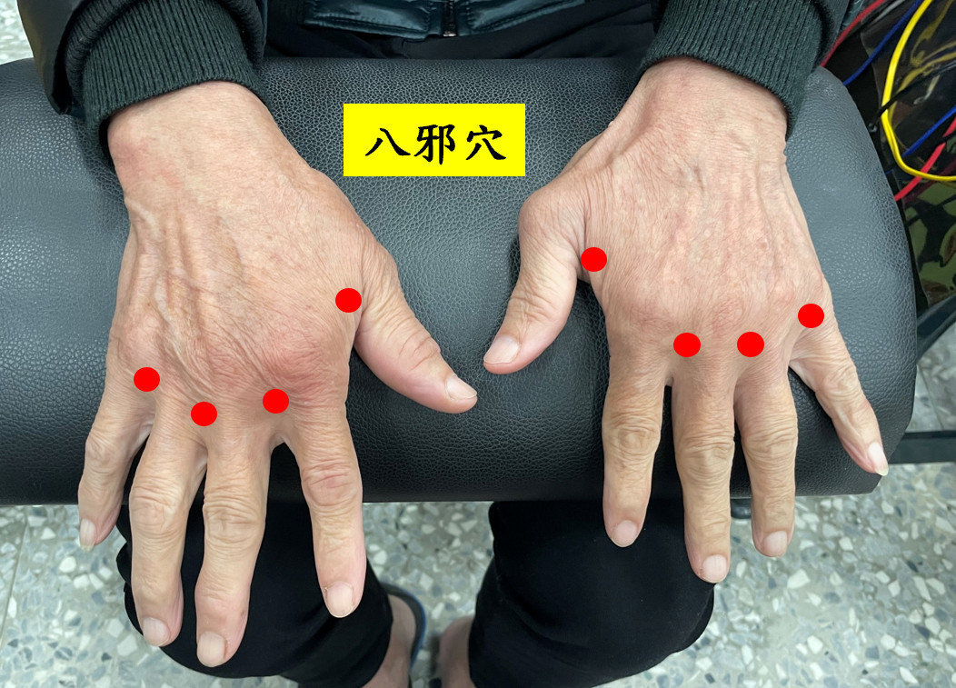 陳醫師指出,中醫將此病歸類為「痺症」、「頑痺」,認為是正氣不足,風、寒、濕、熱等邪氣侵入經絡,導致氣血運行不暢,痰瘀互結於關節,進而引發僵硬腫脹與疼痛。臨床上選用「八邪穴」作為主要治療穴位,該穴位位於手背第一至第五指間的指縫後方凹陷處,因可治療因邪氣所致的病症而得名。該穴位正好位於患處附近,能有效疏通經絡、促進血液循環,緩解關節腫脹與僵硬。