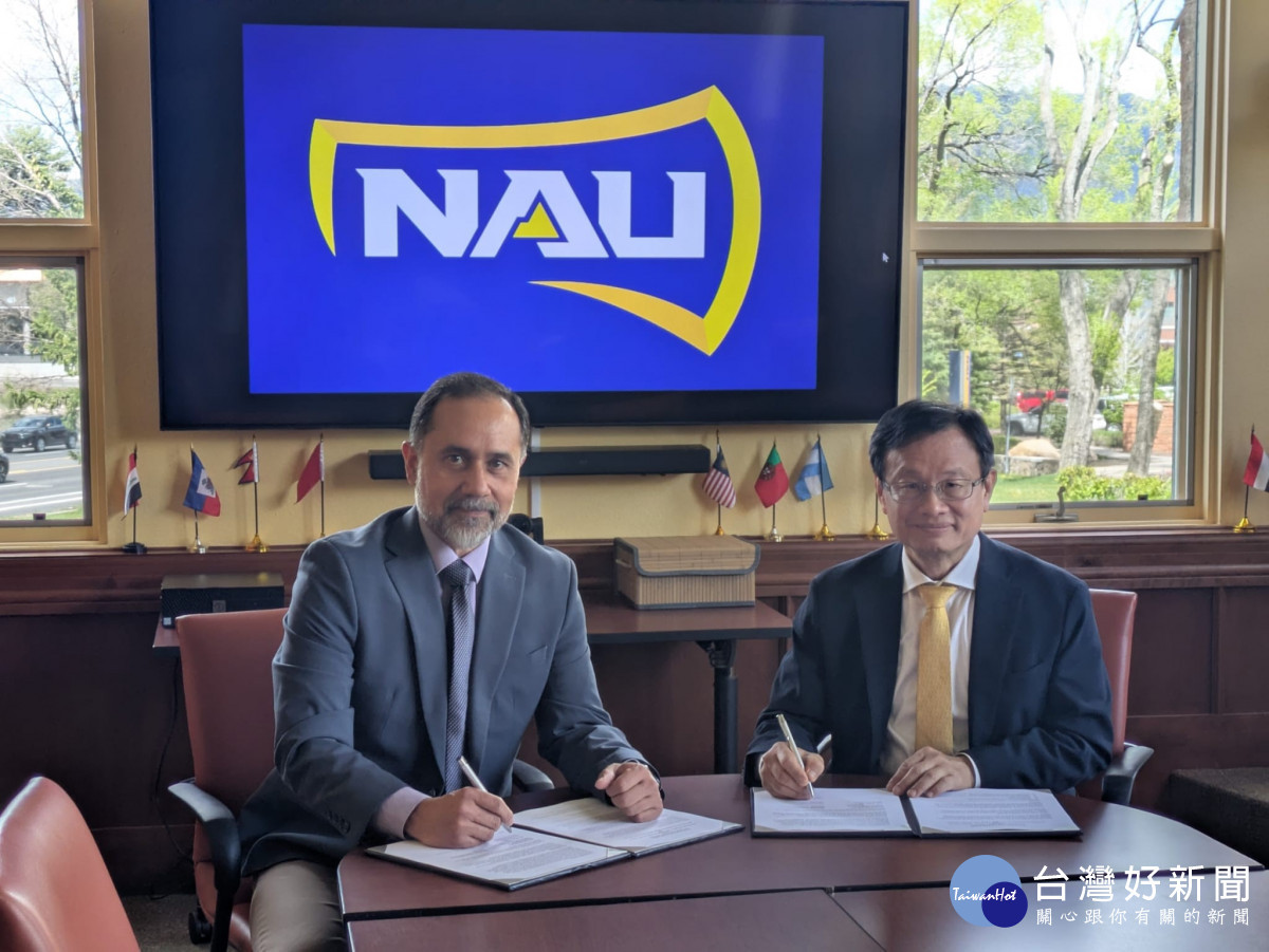 -中原大學半導體產業學院院長傅昭銘(右)與NAU國際副校長Cesar Flores(左)共同簽署兩校學術合作備忘錄。