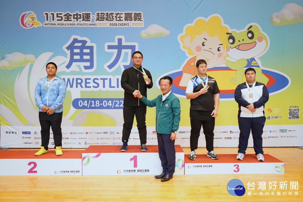115年全國中等學校運動會角力賽事,地主嘉義縣代表隊首日即有斬獲,由東石高中選手莊宇僑拿下本屆賽會嘉義隊首面金牌/嘉義縣府提供