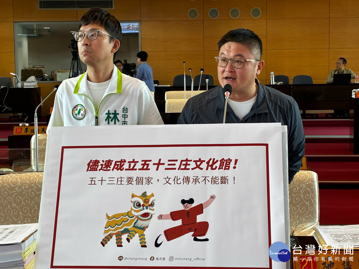 台中市議員施志昌與林祈烽二十日於台中市議教育文化業務質詢,針對台中市文化資源長期「重市中心、輕海線」的現象提出嚴厲批評。他指出,擁有近兩百年歷史、橫跨大甲、大安、外埔與后里四區的「大甲 53 庄」武館、獅頭與宗教文化,正因缺乏系統性保存而面臨凋零危機,公開要求市府評估籌設「大甲 53 庄文化館」,守護全台唯一的武術生態系。