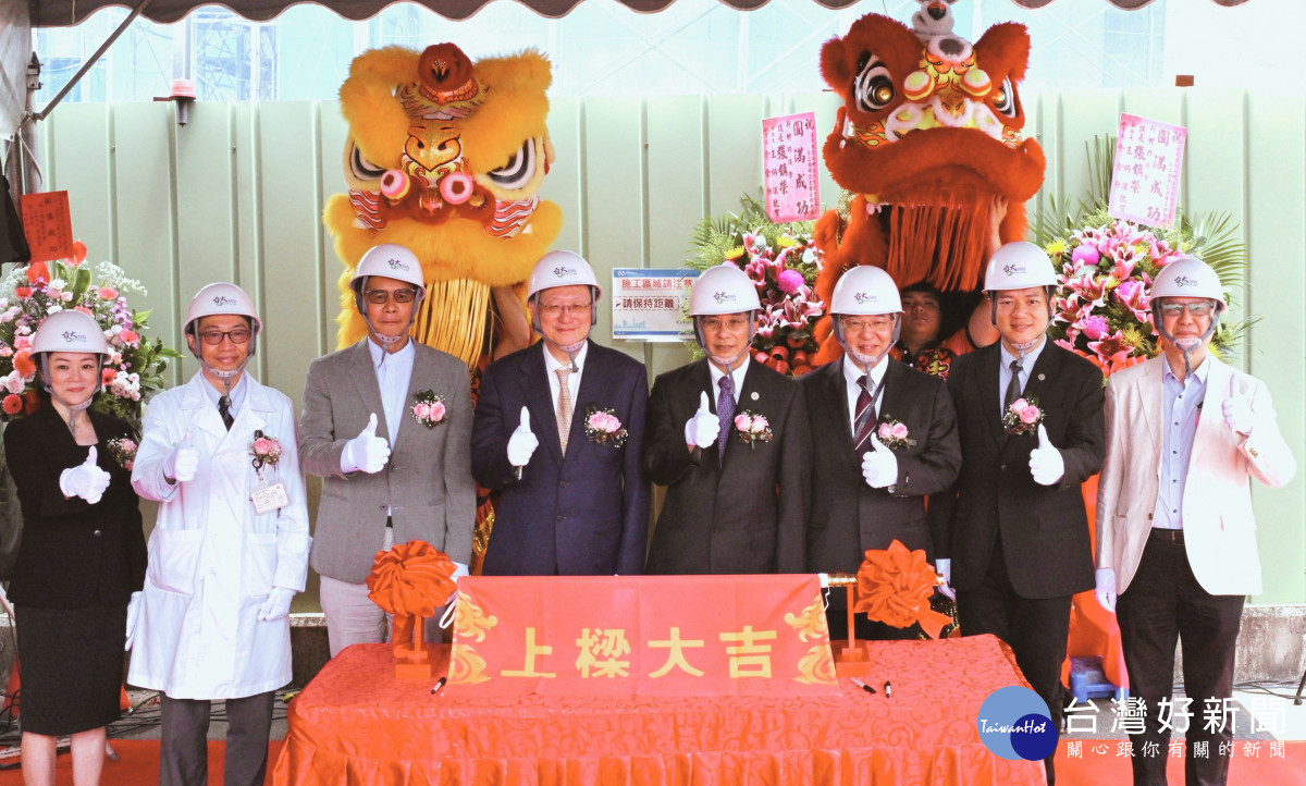 臺灣大學楊志新副校長(右四)、臺大醫院余忠仁院長(左四)、新竹臺大分院洪冠予院長(右三)、新竹科學園區管理局胡世民局長(左三)、新竹市邱臣遠副市長(右二)等貴賓共同於鋼構簽名。