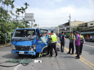 彰縣二水發生貨車追撞 肇事車頭嚴重凹陷駕駛卡車內