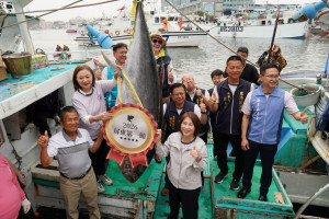 屏東黑鮪魚季邁入第26年,琉球籍漁船「富漁慶2號」不僅捕獲屏東第一鮪,更是台灣第一鮪,8日在東港魚市場舉行拍賣會,由縣長周春米擔任拍賣官,最後由佳珍海產餐廳與澎坊股份有限公司共同競標成功,以每公斤1萬600元得標、總價20...