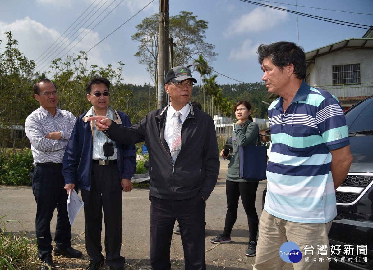 林明溱縣長會勘魚池鄉十一股溪與頭社大排,責成工務處在雨季前完成河川整治,以維護農民安全。〈記者吳素珍攝〉