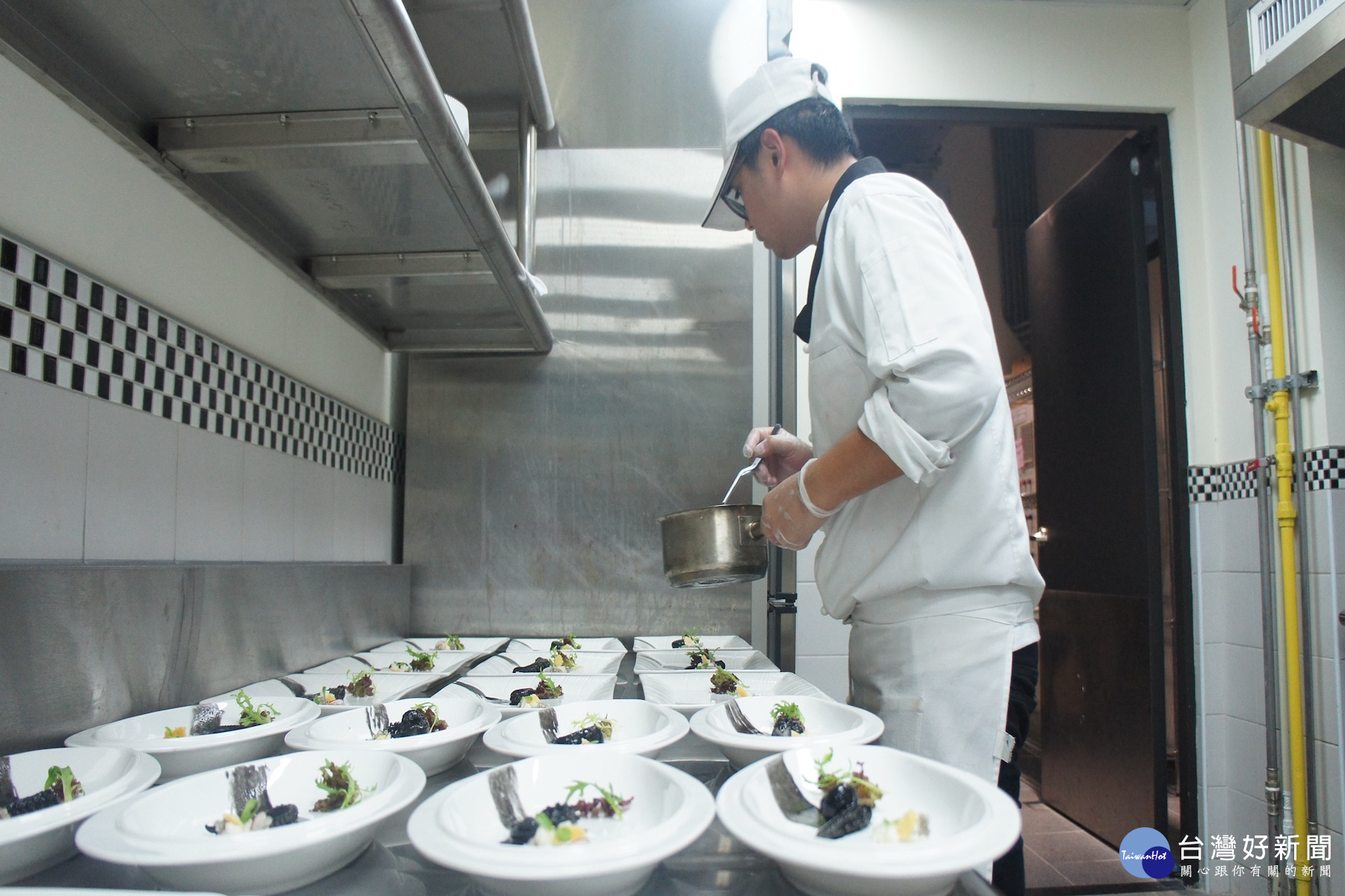 擔任開胃餐點與沙拉餐點的主廚洪唯俊同學認為,每一道菜餚從內場的食材處理,到外場的桌邊服務,都需要團隊再三討論、確認內容才實作,做菜其實不難,如何讓客人消費享用美食,能符合期待並擁有好印象,才是最大的挑戰。