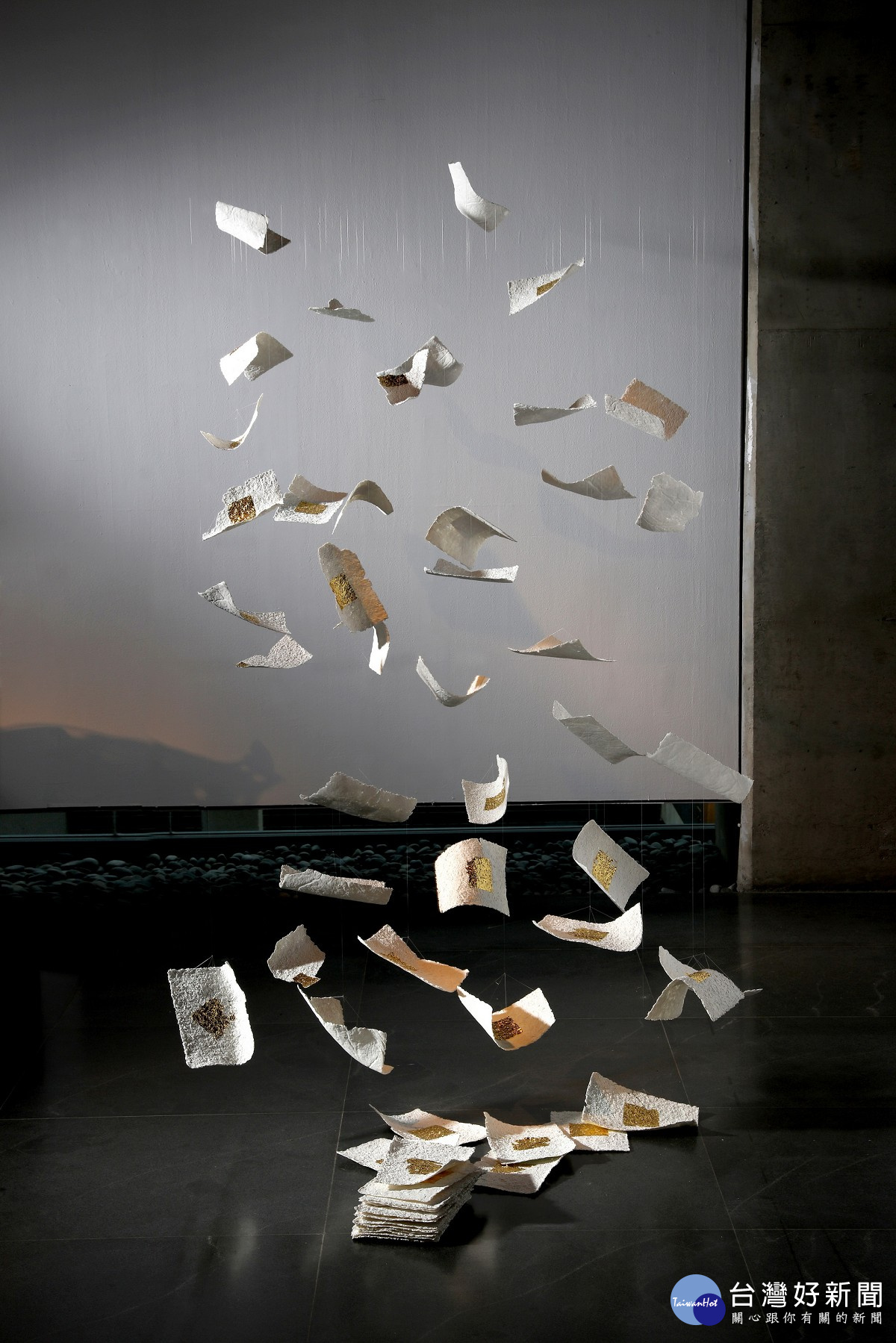 新北市立鶯歌陶瓷博物館3樓特展室展出的「2017台灣陶藝獎」,其中,最特別的是,展出的金紙是陶瓷做的!陶藝家侯春廷的創作呈現金紙在金爐口被吸入的動態畫面,一張張的金紙如同一個個的信息起飛傳遞而出。