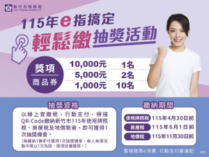 為鼓勵民眾採用e化繳稅,新竹市稅務局推出「e指搞定輕鬆繳」抽獎活動,凡透過線上查繳稅、行動支付或掃描QR Code等方式,繳納新竹市115年定期開徵的使用牌照稅、房屋稅或地價稅,即有機會抽中萬元商品券。歡迎市民朋友踴躍參加,...