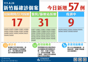 中央疫情指揮中心公布24日新竹縣新增57例新冠肺炎確診病例,其中有17例為居隔期滿或匡列採檢確診,在可控匡列名單內,另有31例為因症就診至醫院採檢PCR確診,另有9案疫調中。這57例同樣為輕...