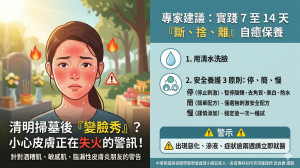 清明連假外出掃墓,強烈陽光與汗水交織,常讓民眾返家後臉部紅通通。對一般人而言或許只是暫時曬傷,但如果您是酒糟肌(玫瑰斑)、敏感肌或脂漏性皮膚炎的朋友,這場「變臉秀」可能是皮膚正在失火的警訊!中華民國美容醫學醫學會...