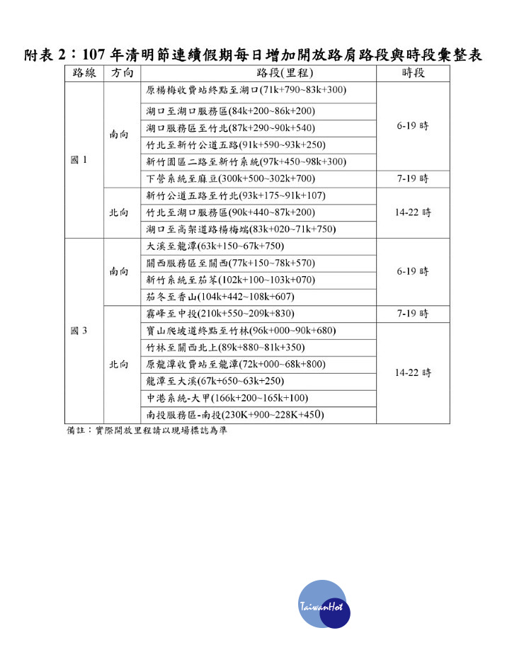 現有開放路肩措施照常實施外,2018年3月24~25日、4月1日及4月4日至8日,每日增加開放路肩路段與時段供小型車行駛如附表2。