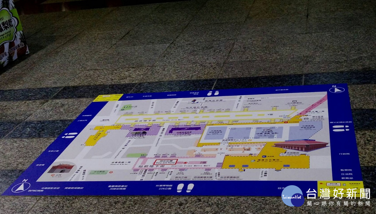 繼北市府交通局在3月29日推出「臺北車站通」室內導航APP,開放民眾免費下載後,觀傳局也推出地貼式地圖,將各車站、地下街、連通道、出入口等位置呈現在長200公分、寬150公分的地圖上,民眾只要站在地圖前就可清楚所在的位置及如何前往目的地。