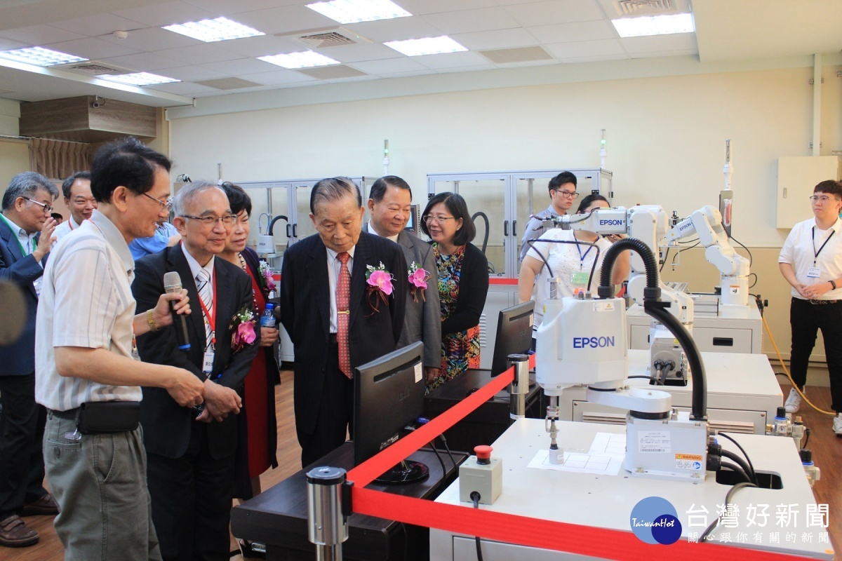 Epson機械手臂南部訓練中心揭牌儀式,由該校創辦人李正合、校長蘇炎坤、圖書館館長閔蓉蓉、台灣愛普生科技公司產業科技事業部總經理王亮國等人主持。