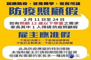 防制武漢肺炎群聚感染,教育部宣佈高中以下各級學校開學日延到2月25日,勞動部則表示,家長可請防疫照顧假,但此舉被罵翻,請勞動部多作說明。台南市勞工局表示,依勞動部指示,家中如有12歲兒童以下...