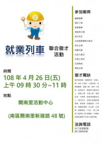 臺南市政府勞工局職訓就服中心將於4月26日上午9時30分至11時,於安平工業區新建路48號開南里活動中心,辦理現場聯合徵才活動,共邀請12家廠商參加,提供120個職缺。有意尋職轉職之民眾可於...
