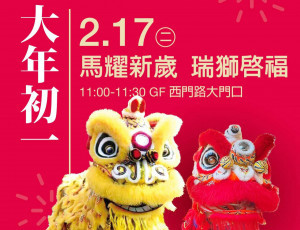 迎接馬年,新光三越台南新天地準備一連串精彩不間斷的新春遊藝節目SHOW,從 2/17(初一) 至2/22(初六)春節連假,台南新天地熱鬧迎新春。從祥獅獻瑞揭開序幕、震撼戰鼓迎福開春,到財神發放開運錢龜、火舞與藝陣,最後以鹿耳門天后...