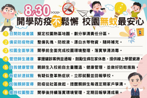 為減少登革熱疫情於開學後造成校園威脅,台南市教育局提出8項開學防疫策略供參考,希望有效提升學校防疫力。教育局表示,已積極督導各校,於開學前動員可用人力,落實巡、倒、清、刷,務必完成校園環境清...