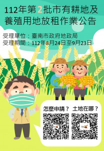 為落實「新農人、青農返鄉」政策及提升南市經管市有耕地之土地經濟效用,市府地政局持續辦理放租作業。因應數位科技時代來臨,地政局提供更貼心、便利的服務以網路代替馬路,運用Google導覽,並提供...