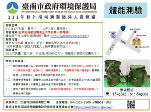 臺南市政府環保局111年清潔臨時人員招考,將於12月3日、4日在遠東科技大學(新市區中華路49號)舉行體能測驗,應考人報到時間與測驗規則等資訊,已公告在環保局全球資訊網(https://we...