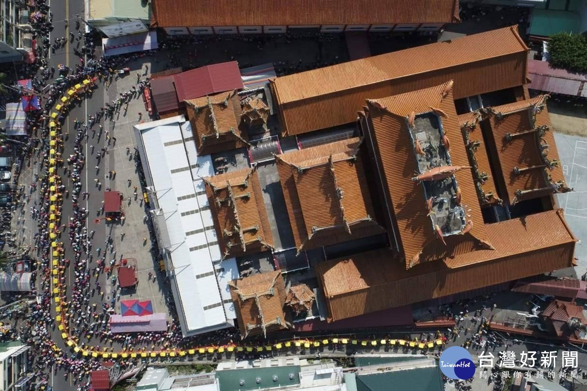 百足真人蜈蚣陣繞行慶安宮空拍。(空拍照由劉芳吉提供)