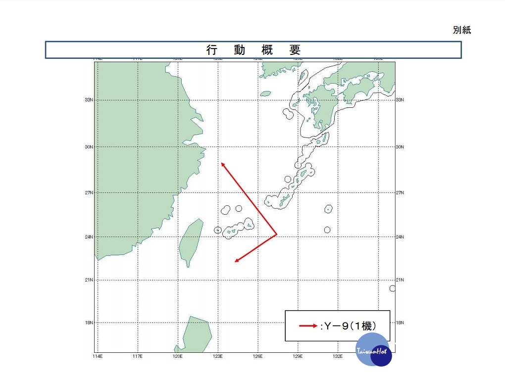 依據日本防衛省統合幕僚監部今(4)日發布的公告,中共軍方1架運9型電偵機,今日從東海海域飛至宮古海峽航道,再轉西南往台灣東南方海面飛行,繞台後再飛返中國。