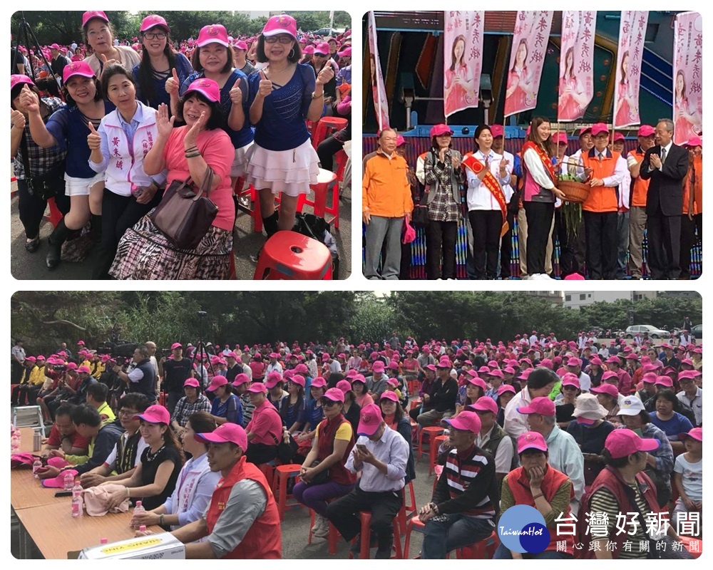 桃園市市議員(楊梅區)候選人黃朱秀娥,成立競選總部,前內政部長黃主文親臨站台造勢,地方人士千餘人與會,凍蒜聲響徹雲霄。
