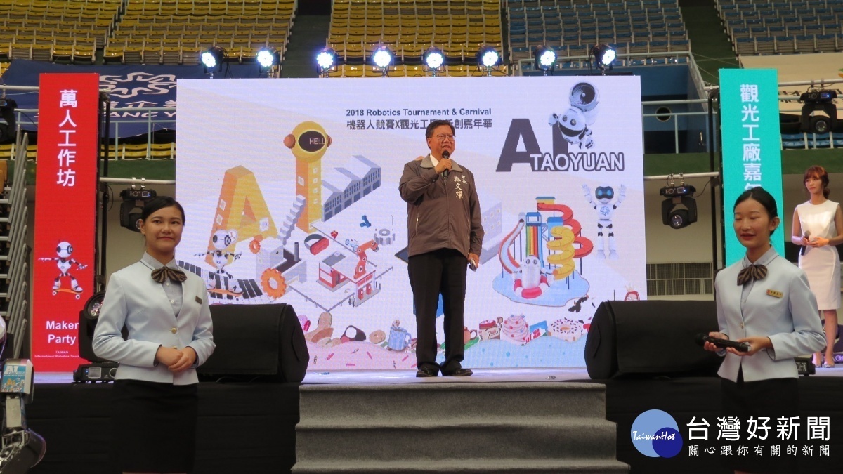 全台最大規模「AI TAOYUAN機器人競賽X觀光工廠X新創嘉年華」19日至21日在桃園巨蛋展出,桃園市長鄭文燦今日特別蒞臨參觀。此次嘉年華匯聚了全台150組新創團隊展出作品,1500組國內外隊伍競逐機器人競賽,30家觀光工廠展售體驗,萬人親子創客體驗坊,吸引上萬人次民眾參加。鄭市長表示,這項嘉年華活動是桃園市新創推廣與科技產業能量的大閱兵!市府會持續舉辦這項嘉年華活動,也會逐步增設創客學習中心,打造桃園成為創客的聚落。邀請民眾一同來參觀、體驗桃園文創智慧城的魅力。