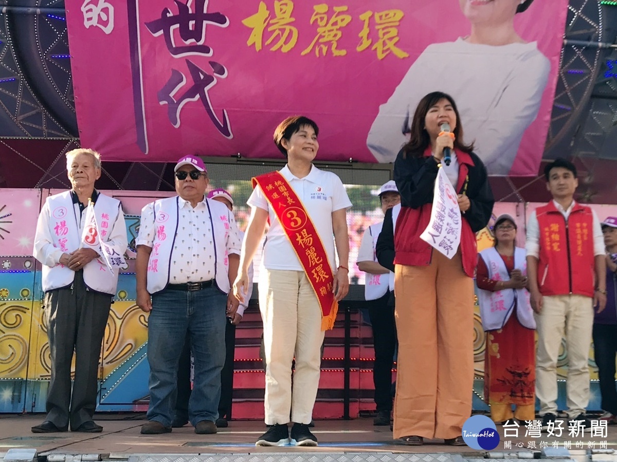 包括前民進黨立委許國泰、新黨全國委員陳麗玲、致公黨主席陳柏光及客家婦女後援會多人站台力挺,吸引許多民眾到場參加。楊麗環表示,他當選市長要實現桃園人有錢、健康、快樂三大願景,學習德國舉辦桃園世界商業、工業大展,讓全世界企業老闆來桃園參展、做生意,來台參展2到4週要吃、住、觀光、資訊花費,一天花5000元,一次參展來台5萬人,桃園一天可賺2.5億元,讓桃園人賺大錢。