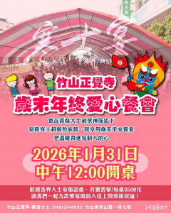 歲末年終,溫情滿竹山!為了讓獨居長者與清寒家戶在寒冬中能享有一頓暖心的團圓飯,「寒士午宴」將於 2026年1月31日(正月初三)在竹山正覺寺盛大舉行。本次預計席開 25 桌,提供豐盛的應季年菜。主辦單位表示,目前經費募集已接...