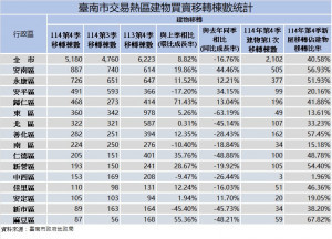 臺南市114年第4季土地與建物買賣移轉統計資料出爐,本季土地買賣筆數為9,903筆,與前季相比,增幅為8.96%,而與113年第4季相較,減幅達23.81%。本季建物買賣棟數為5,180棟,較上季增加8.82%,與113年第4季相比衰退16.76%;其中,...