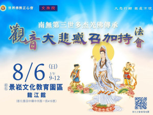 農曆六月十九日為觀世音菩薩吉祥日,世界佛教正心會8月6日(周日) 將於彰化縣田中景松文化園區龍江館舉辦觀音大悲感召加持法會,恭請世界佛教正心會修大悲忍辱的指導金剛上師  庫...
