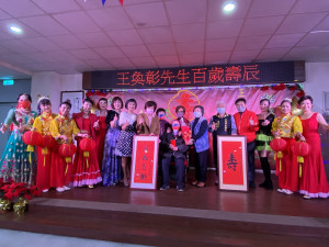 板橋榮家王奐彰百歲壽辰 致贈祝賀壽屏及金壽桃項鍊