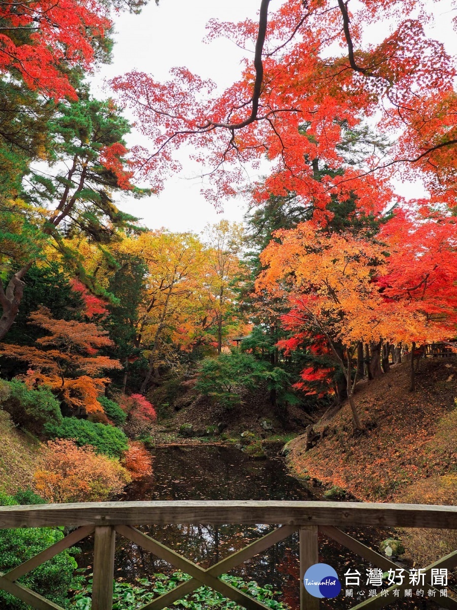 秋季的見晴公園一眼望去,林立的楓樹猶如披了一件鮮紅的袍子,秋色宜人。(圖/喜鴻假期提供)